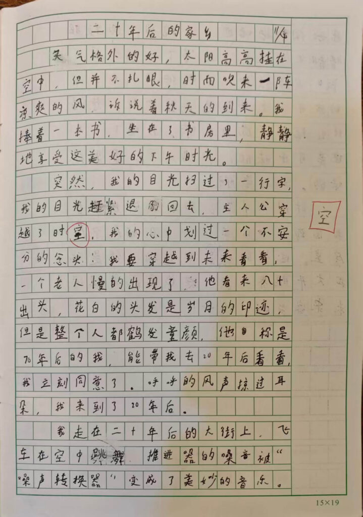 突然,我的目光扫过了一行字,我的目光赶紧退了回去,主人公穿越了时空,我的心中划过一个不安分的念头:我要穿越到未来看看,一个老人慢慢地出现了,他看来八十出头,花白的头发是岁月的印迹,但是整个人都鹤发童颜,他自称是70年后的我,能带我去20年后看看,我我立刻同意了。呼呼的风声掠过耳朵,我来到了20年后。