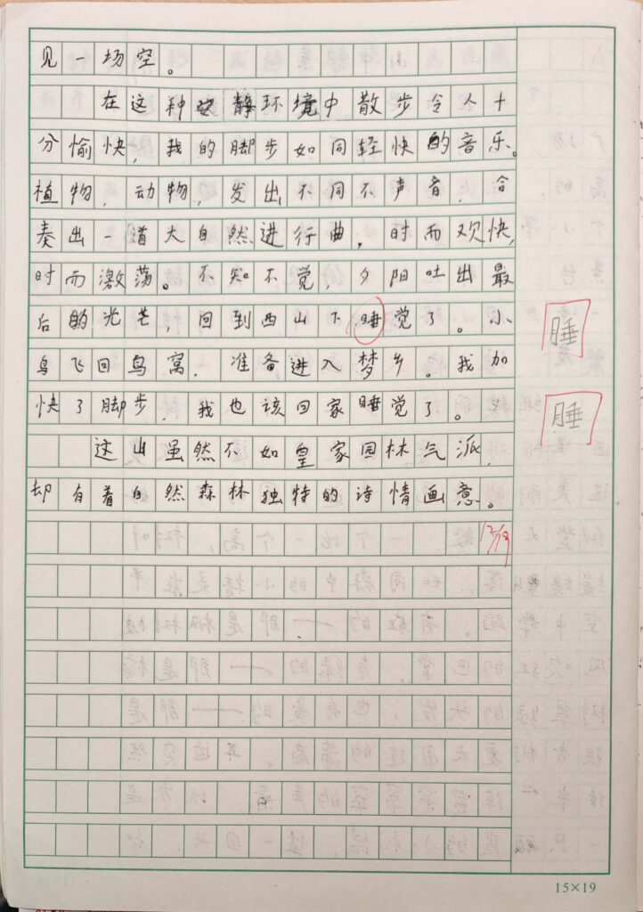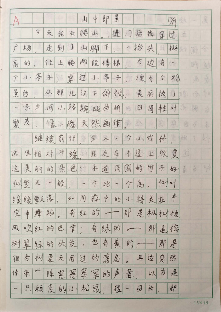 今天我去爬山。进门后我穿过广场,走到了山脚下,一抬头,挺高的,往上爬两段楼梯,右边有一个小亭子,穿过小亭子,便有个观景台,从那儿往下俯视,美丽极了,一条乡间小路蜿蜒曲折,四周枝叶繁茂,像一幅天然画作。