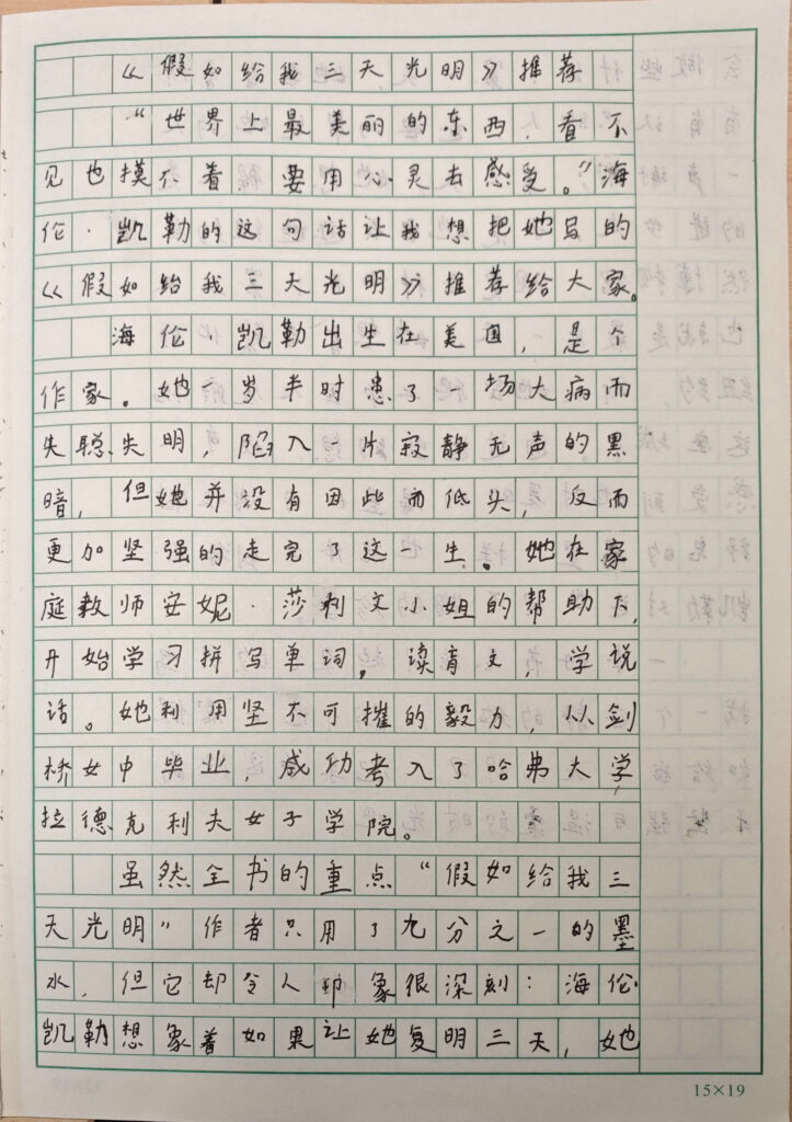 “世界上最美丽的东西,看不见也摸不着,要用心灵去感受。”海伦·凯勒的这句话让我想把她写的《假如给我三天光明》推荐给大家。
