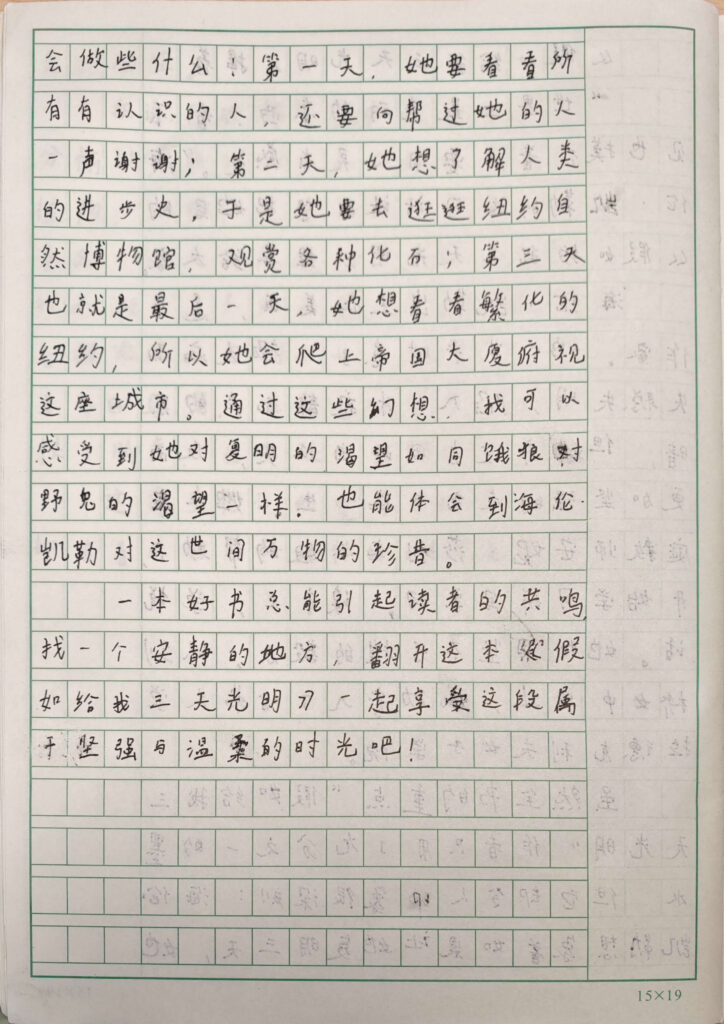 虽然全书的重点“假如给我天光明”,作者只用了九分之一的墨水,但它却令人印象很深刻:海伦·凯勒想象着如果让她复明三天,她会做些什么:第一天,她要看看所有认识的人,还要向帮过她的人说一声谢谢;第二天,她想了解人类的进步史,于是她要去逛逛纽约自然博物馆,观赏各种化石;第三天也就是最后一天,她想看看繁华的纽约,所以她会爬上帝国大厦俯视这座城市。通过这些幻想,我可以感受到她对复明的渴望,如同饿狼对野鬼的渴望一样,也能体会到海伦·凯勒对这世间万物的珍惜。